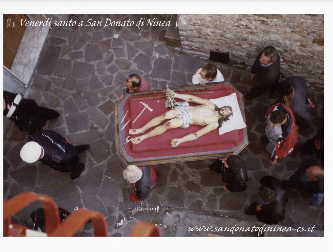 S’accompagna il Cristo morto e la statua della Santa Vergine,vestita in nero,dalla chiesa al